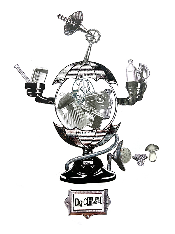 De retour en classe, les élèves ont déterminé dans une séance collective de "brainstorming" ce qu'est le progrès aujourd'hui, pour eux. Une liste a été établie : la lutte contre le réchauffement climatique, contre les violences domestiques, contre la pollution, contre la fermeture d'esprit, … Puis, chaque élève a inventé une "bonne chose" surréaliste ayant la fonction de lutter contre l'un de ces items. Pour donner forme à leurs créations, les élèves ont expérimenté le collage surréaliste.